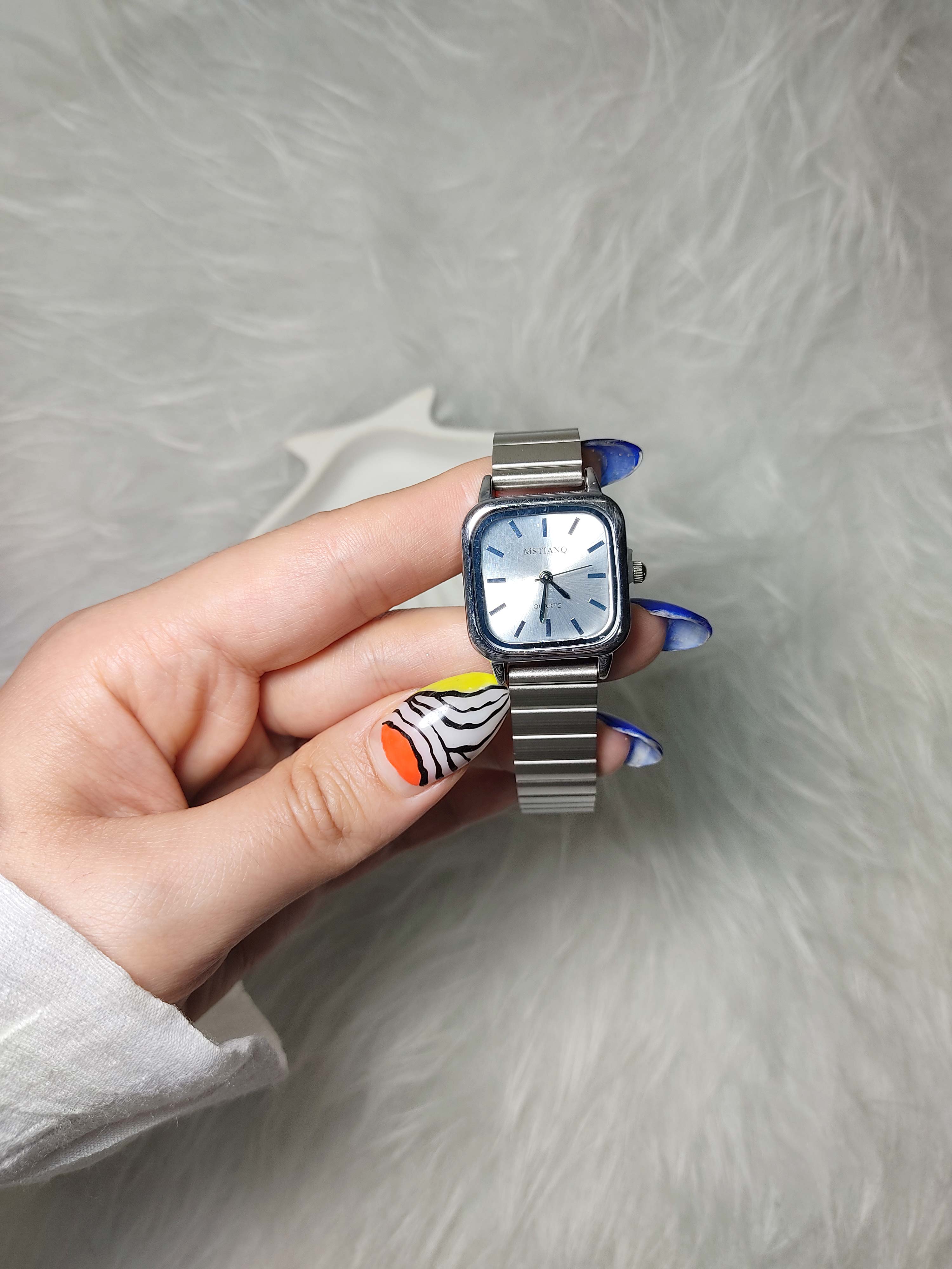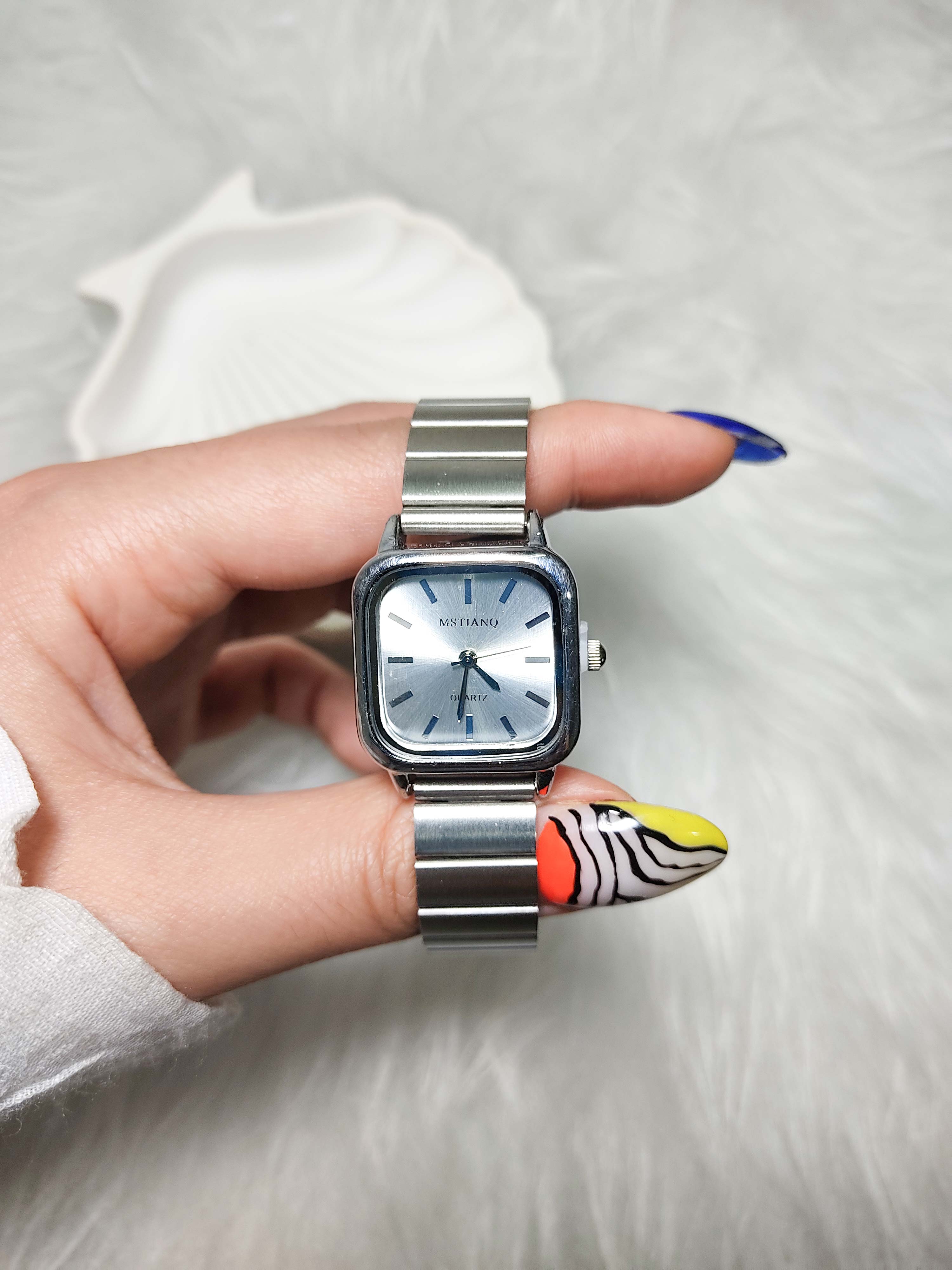 ساعت مچی زنانه مدل آریا با طراحی صفحه مربعی و بند فلزی نقره ای، انتخابی خاص برای خانم هایی است که به استایل مینیمال و شیک علاقه دارند.