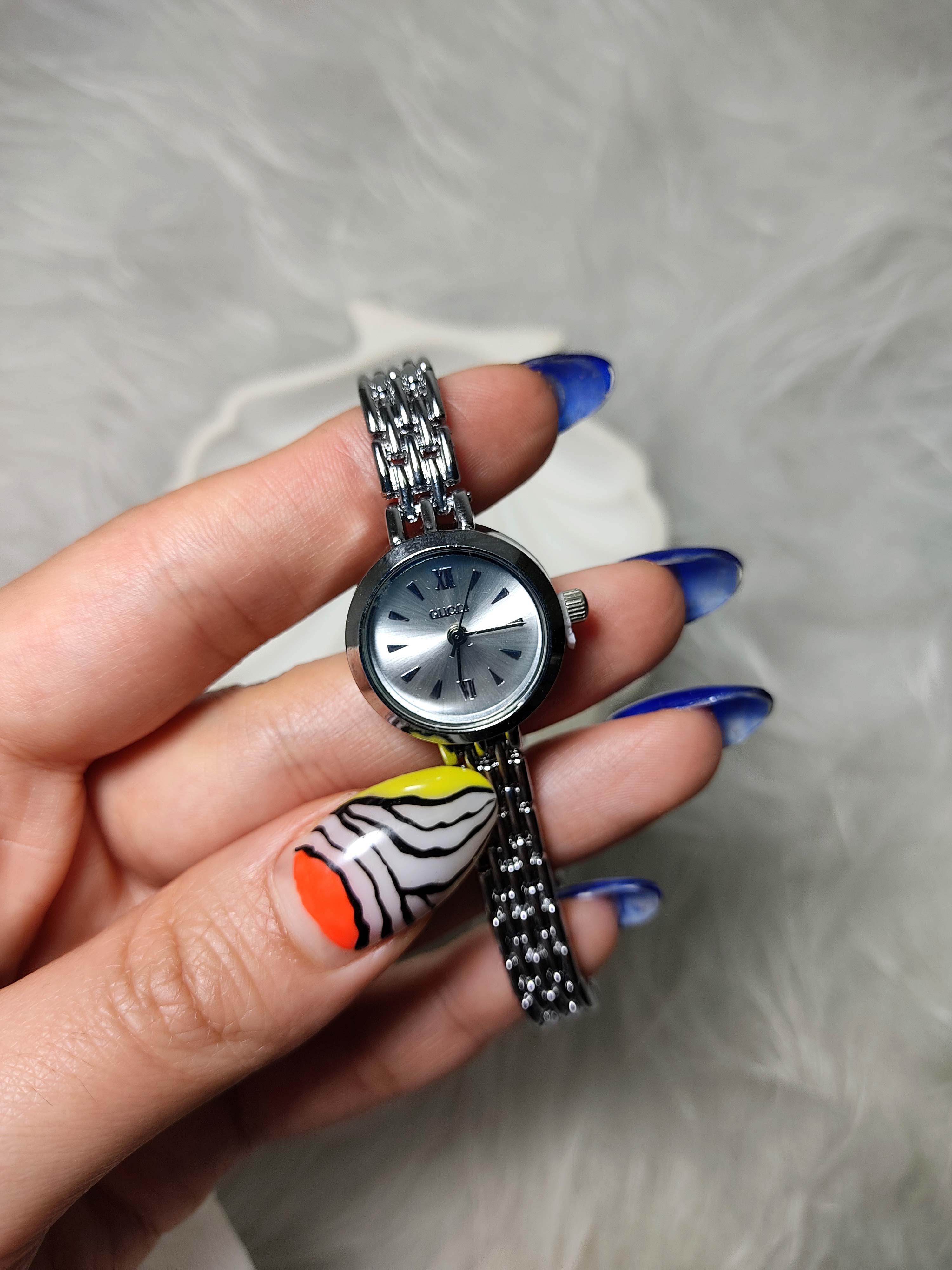 بدنه و بند نقره ای این ساعت در کنار صفحه ی طوسی براق، جلوه ای مدرن و چشم نواز ایجاد کرده که به راحتی با استایل روزمره یا مجلسی ست می شود.