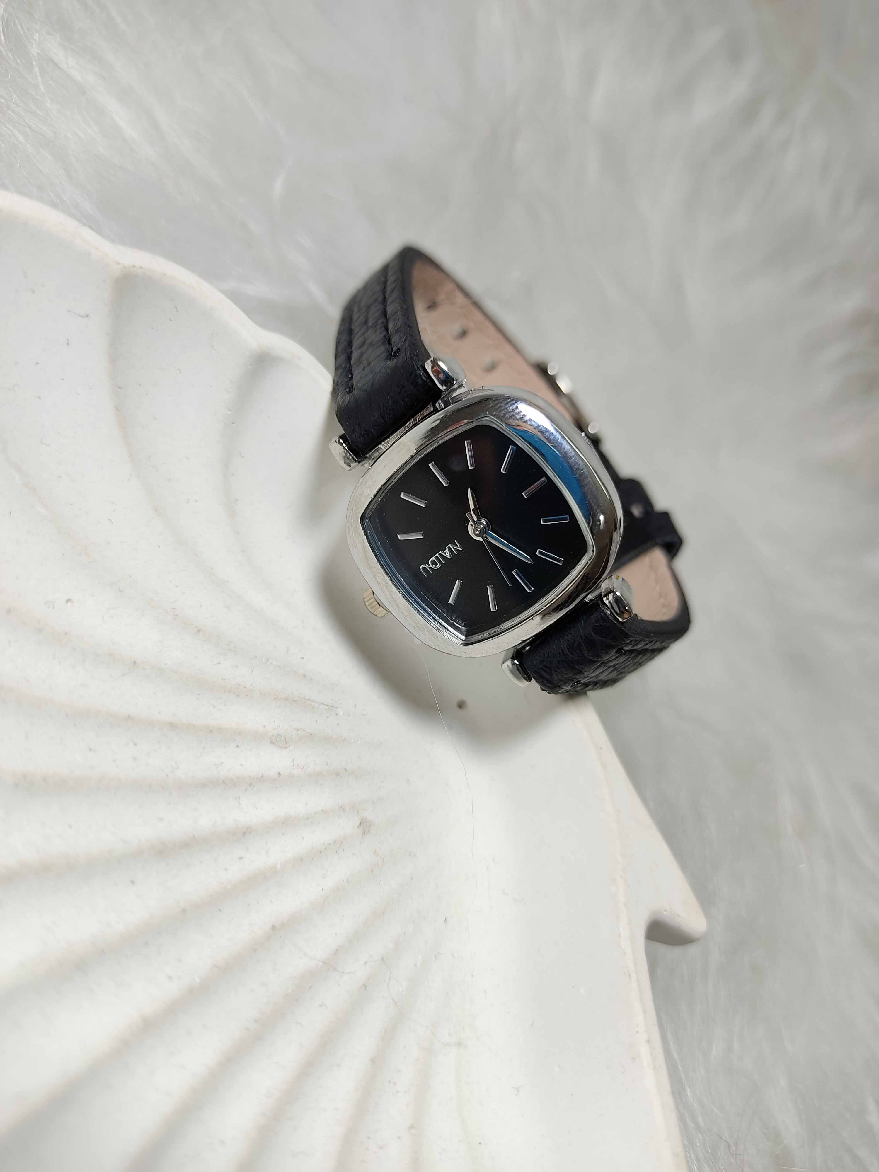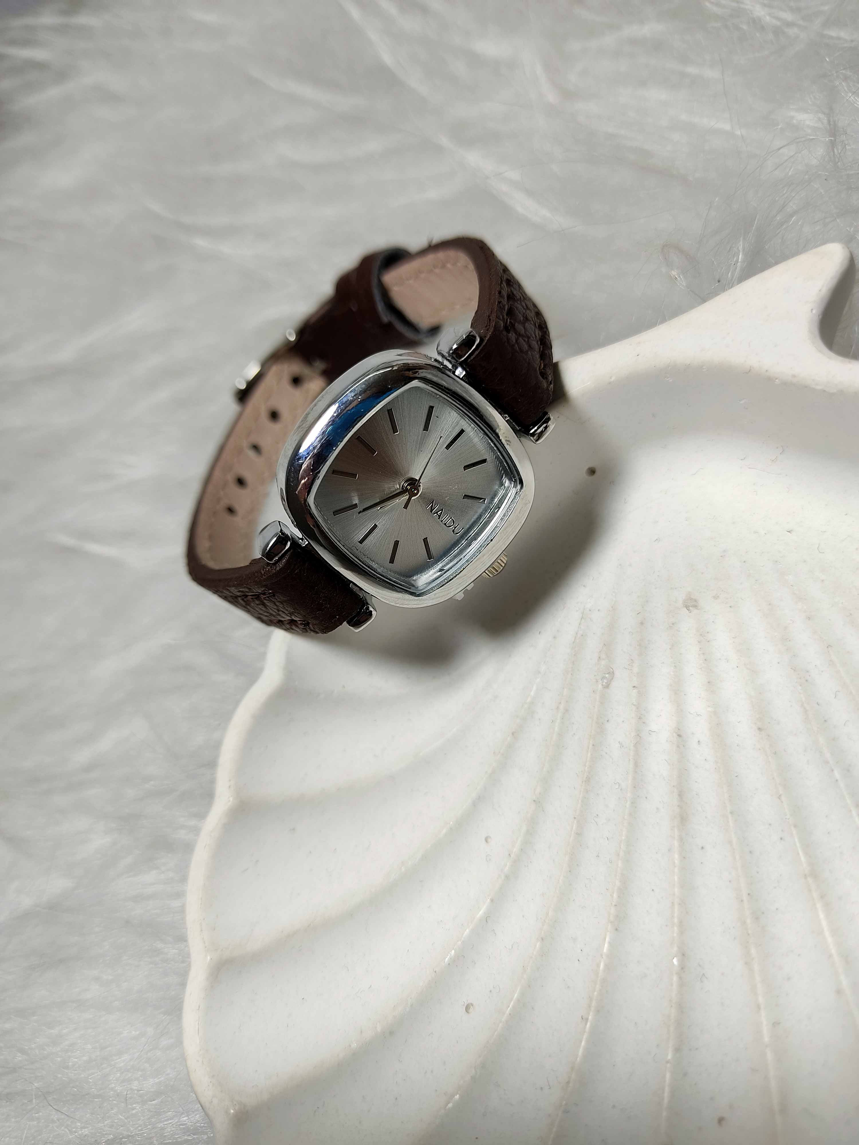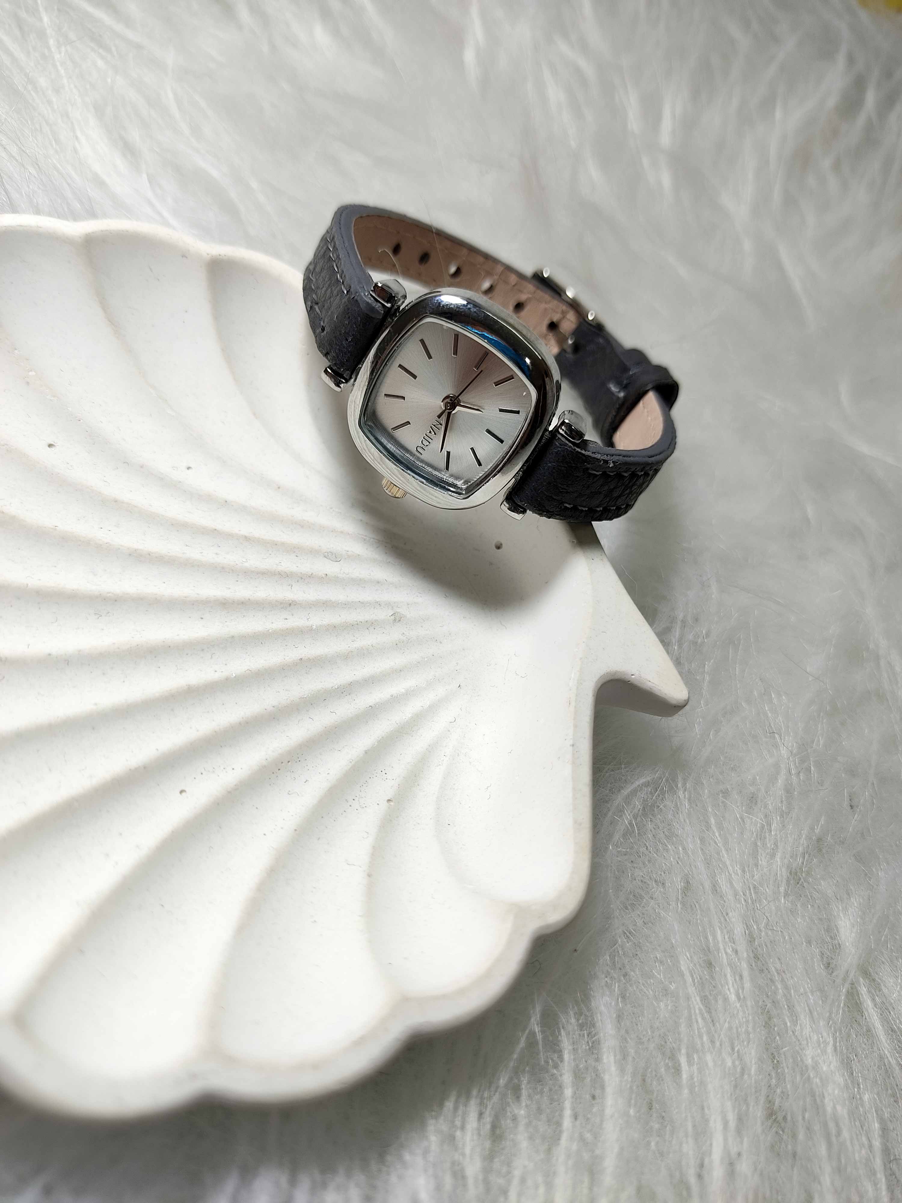 طراحی صفحه مربعی با قاب نقره ای براق، در کنار بند چرمی کلاسیک، ترکیبی ساده اما بسیار شیک ایجاد کرده که به راحتی با استایل های مختلف ست می شود.